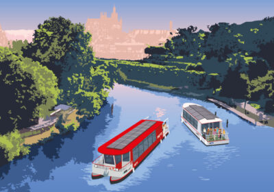 METZ'O reprend du service le 4 Avril ! Deux bateaux électriques relient le centre-ville de Metz (Moyen Pont) à Moulins-lès-Metz en passant par le Saulcy, St-Symphorien, Longeville Centre et Scy-Chazelles.
